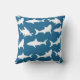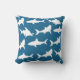 Silhuetas brancas modernas de tubarão travesseiro decorativo em azul-oceano. Excelente para um quarto de criança, ou qualquer decor náutico!
