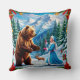 Uma paisagem de inverno mágica com uma donzela de neve vestida de vestido azul interagindo com uma cerveja. Montanhas cobertas de neve e decorações festivas fortalecem a atmosfera sazonal e pacífica.