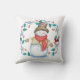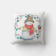 Este travesseiro decorativo de Férias giro tem um bonitinho bonitão vestido de chapéu, cachecol de inverno, jaqueta e luvas. Com um grande sorriso no rosto, ele está olhando para um pequeno pássaro cardeal vermelho que está empoleirado em uma folha azul e uma coroa vermelha de morango. As imagens são colocadas sobre um fundo branco de neve. Ambos os lados do travesseiro têm a mesma imagem.