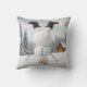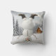 A whimsical snowman stands upside down with boots on its head as snow gently falls, revealing a cozy cabin in the snowy background
