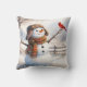 A cheerful snowman wearing a plaid scarf and hat stands in a snowy field while a vibrant red cardinal adds a pop of color by perching on one of its stick arms