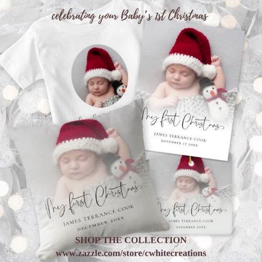 Modern Baby First Christmas Photo Overlay. Perfeito para comemorar o Natal de 1rua e a manutenção do excelente do seu bebê por anos. Basta substituir a imagem de exemplo pelo seu favorito, que também está no verso e mudará simultaneamente. Meu Primeiro Natal está em um roteiro de na moda e personaliza facilmente o resto do texto.