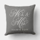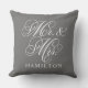 Travesseiro de sotaque quadrado elegante para casais felizes e recém-casados apresenta um roteiro branco, Sr. e Sra. design, com um texto monográfico personalizado que pode ser personalizado com o sobrenome casado. A cor de fundo da cinza de carvão pode ser personalizada para coordenar com as cores de decoração da sua casa ou do seu quarto.
