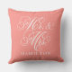 Travesseiro de sotaque quadrado elegante para casais felizes e recém-casados apresenta um roteiro branco, Sr. e Sra. design, com um texto monográfico personalizado que pode ser personalizado com o sobrenome casado. A cor de fundo rosa cor-de-fundo cor-de-rosa do salmão-coral pode ser personalizada para coordenar com as cores do decorador doméstico ou do quarto.
