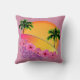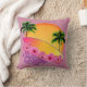 Garota surfista com conselho surf, palmeiras, pôr do sol e flores de hibisco.