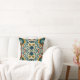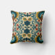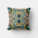 Square throw pillow with symmetrical floral patterns in teal, orange, and yellow on a cream background. Energetic and vibrant vintage style.