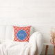 Um travesseiro decorativo quadrado de padrão quatrefoil marroquino vermelho-alaranjado com um crachá azul ao qual você pode personalizar adicionando seu nome e monograma inicial. Esta é parte da Coleção de Quatrefoil de Tomate de Cereja e Primavera de Palácio Azul