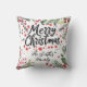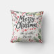 Este travesseiro de Natal simples e na moda apresenta uma coroa estonteante de aquarela com folhas verdes e falsas de ouro e groselhas vermelhas, e uma tipografia vermelha moderna de roteiro que diz "Feliz Natal" em um fundo branco.