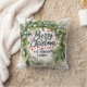 Este travesseiro de Natal simples e na moda apresenta uma coroa estonteante de aquarela com folhas verdes e falsas de ouro e groselhas vermelhas, e uma tipografia vermelha moderna de roteiro que diz "Feliz Natal" em um fundo branco.