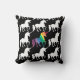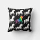 Travesseiro preto e branco do teste padrão do unicórnio do arco-íris do divertimento. O teste padrão preto e branco à moda do unicórnio cobre a parte dianteira e a parte traseira deste travesseiro do divertimento. Um unicórnio brilhante e colorido do arco-íris no brushstroke da aguarela está para fora no centro em cada lado. O unicórnio vermelho, alaranjado, amarelo, verde, azul, e roxo adiciona um respingo do divertimento ao design monocromático. Design lindo, moderno e à moda do unicórnio.