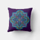 Throw pillow with a richly colored purple background that shows off a intricate mandala in shades of blue. A vibrant accent for home decor.