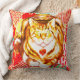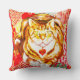 Tiger cat pillow with red decorative designs background. Very colorful with red white, oranges with dark brown accents. Cute, decorative.and adds charm and coziness to room.