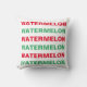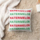 Travesseiro decorativo de melancia projetado por Nisha Prabhu CuteHomeGifts. Este design apresenta o texto de tipografia vermelho e verde ''WATERMELON'' no lado frontal e o padrão de listras verdes vermelhas no verso. Travesseiro de melancia tropical da fruta de Verão.