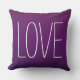 design na moda e travesseiro de sotaque quadrado chic apresentam tons de ameixa profunda, roxo e berinjela com texto "LOVE" em branco.