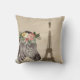 Na moda travesseiro decorativo apresenta foto de fundo de sépia sépia pia pintage da Torre Eiffel com uma camada de belo retrato de zebra de aquarela com coroa floral