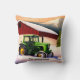 O trator verde favorito de um agricultor está estacionado na frente de um celeiro vermelho na neve.