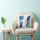 Esta imagem mostra um travesseiro decorativo quadrado branco com um desenho abstrato de pinceladas em negrito em vários tons de azul, cor-de-rosa. O travesseiro é exibido contra uma cinza de luz, enfatizando o padrão vibrante e moderno.
