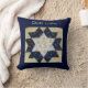 Uma seção de um único bloco de colcha. Texto "Amante de Colchas" em letra cursiva branca. Bloco: Padrão "flor estrela" amarelo, branco e azul escuro bordado. A "estrela" central é branca com patos amarelo escuro. Isso é cercado por "pétalas" de azul escuro com flores vermelhas, azuis e amarelas. Ao redor disso está xadrez gingham amarelo e branco. Fundo/verso do travesseiro é azul escuro.