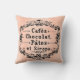 Ilustração comercial francesa antiga com beira e texto decorativos que lê cafés, Chocolat, pastas e Sirops (café, chocolate, pasta e xaropes). Travesseiro decorativo bonito, no estilo country francês. O fundo é um rosa macio com a aparência subtil da textura e apenas uma sugestão de um efeito antiquing. A imagem está em um lado, a outro tem simplesmente a luz bonita - cor cor-de-rosa e efeito antiquing. Este travesseiro está disponível em dois tamanhos, no 20" x 20" quadrado, e no estilo (retangular) lombar, que is13 X 21 avança. Que travesseiro bonito para alguma chique ou decoração parisiense do estilo! Nós temos uma linha completa de travesseiros que complementam este em nossa loja.