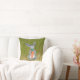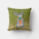 O coelho segurando uma cenoura laranja está parado em um campo de grama verde. A relva de fundo é replicada na parte de trás do travesseiro.