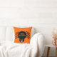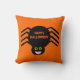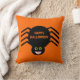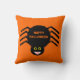 Este travesseiro espetacular apresenta uma aranha preta assustadora com oito pernas peludas, olhos amarelos com grandes pupilas pretas e sua boca aberta mostrando suas presas. Há um texto laranja que diz "Feliz Dia das Bruxas" e um fundo laranja correspondente.