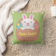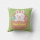 Decorre a sua festa de Páscoa com este travesseiro decorativo do tema da Páscoa, bonito e colorido! Ele tem um coelho branco surgindo da cesta de ovos decorados de Páscoa como padrão de estrelas ou padrão de gesso e pontos. Personalize com sua própria mensagem de saudação no cesto.