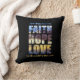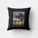 Travesseiro inspiracional com design de pôr do sol de tipografia. O texto diz "Três coisas duram para sempre. Fé, Esperança, e o maior deles é o amor." (É uma paráfrase da conclusão do Primeiro Corintiano 13 no Novo Testamento da Bíblia.)