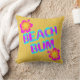 Vozes engraçadas de Beach Bum dizendo em aflitivas letras de madeira derivada em cores brilhantes e azuis do oceano com um contorno amarelo arenoso em um fundo de tapete vermelho falso. Perfeito para descansar à volta da praia, piscina de natação ou quintal. Clique em Personalizar para alterar o tamanho da imagem, as cores de fundo do travesseiro e muito mais.