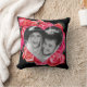 Almofada de lançamento de foto personalizável do Dia dos Namorados com um buquê de rosas vermelhas. Almofada quadrada com moldura de foto de rosa em forma de coração tem fundo preto na frente e atrás, com suas iniciais no verso da almofada. A foto pode ser cortada e posicionada para caber na forma de coração. As camadas podem precisar ser desativadas temporariamente para mover a foto.