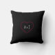 Almofada de lançamento de foto personalizável do Dia dos Namorados com um buquê de rosas vermelhas. Almofada quadrada com moldura de foto em forma de coração tem fundo preto na frente e atrás, com suas iniciais na parte de trás da almofada. A foto pode ser cortada e posicionada para caber na forma do coração. As camadas podem precisar ser desativadas temporariamente para mover a foto.