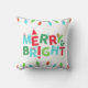 Um travesseiro de Natal brilhante com a frase 'Feliz e Brilho' em tons brilhantes de vermelho, verde e lacre.