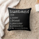 Adorável travesseiro decorativo decorativo só para o seu marido amoroso com um design de tipografia branca e a sua cor de fundo e a cor do lado de trás do travesseiro! Para alterar a cor do plano de fundo, use o botão personalizar. O texto também pode ser adicionado ao lado frontal ou traseiro. O travesseiro diz: Marido, substantivo 1. amante 2. amigo 3. fornecedor 4. protetor 5. tudo
