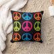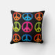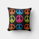 Travesseiro preto com sinais de paz brilhantes de cor neon.
