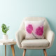 Este é um travesseiro decorativo branco decorado com uma fotografia de diversas tulipas cor-de-rosa.