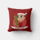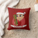 Travesseiro decorativo com uma ilustração de um lindo menino feliz sorridente, ele está vestindo fantasia vermelha e branca do Papai Noel e segurando um presente; com texto editável modelo para seu nome ou mensagem, design de Natal com fundo vermelho