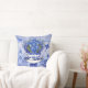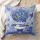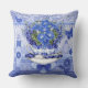Um travesseiro decorativo com um impressão de um antigo copo de porcelana cheio de flores azuis e borboletas contra um fundo antigo de rendas. Parece excelente como um par com Aves Porcelanas Azuis e travesseiro de Birdcage.