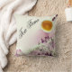 Um retrato encantador de uma xícara de chá convidante ao lado de um pacote de pequenas flores violetas e brancas em uma sutil violeta clara e pano de fundo branco com a legenda "Tempo do chá". Perfeito para um sofá aconchegante, salão de chá.