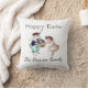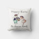Este travesseiro decorativo personalizado apresenta uma imagem de Páscoa antiga junto com o texto "Felz pascoa". Você pode personalizar este travesseiro com o sobrenome de sua família usando o modelo personalizado.