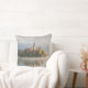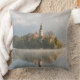 Travesseiro decorativo com um nascer do sol nevoento no lago Bled com a ilha com igreja e névoa com reflexão na água na primeira luz solar da manhã em Slovenia.