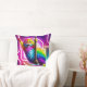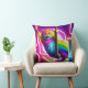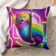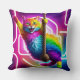 Este conceito de design mostra um lado de um travesseiro decorativo de dois lados, representando um gato colorido vibrante com pele brilhante pendurada de uma corda contra um pano de fundo néon brilhante em um estilo de arte 5D.