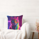 Conceito para a frente de um travesseiro de dois lados: uma imagem de arte visualmente impressionante em 5D de um gato colorido pendurado numa corda, a pele iluminada com um brilho contra um fundo néon vibrante.