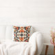 Este travesseiro atraente mostra um design tribal ousado com formas geométricas agudas em vermelho, laranja, bronzeado e preto. A simetria e o contraste de cores trazem um forte interesse visual e talento cultural para qualquer sala. Ideal para rústica, boho ou decoração étnica moderna.