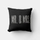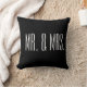 Travesseiro é mostrado em preto com texto em branco: Mr. & Mrs.