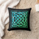 Um travesseiro decorativo de um nó celta azul-esverdeado design contra um fundo preto.