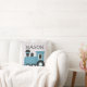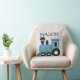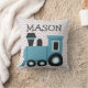 Travesseiro decorativo decorativo para crianças, com um trem azul e cinza sobre um padrão de chevron - personalize-o com o nome da criança para uma ideia de presente única.