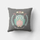 Um travesseiro que caracteriza um design temático da floresta com uma ilustração de uma coruja do bebê dentro de uma grinalda decorada com folhas, flores, e uma bolota. Personalize o nome. O fundo é teste padrão cinzento da viga.
