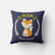 Um travesseiro com um design com o tema da floresta, ilustrando um dentro de raposa bebê, decorado com folhas, flores e uma bolota. Personalize o nome. O plano de fundo é o padrão do diafragma azul escuro.