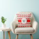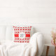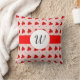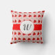 Um travesseiro personalizado com uma letra em roteiro dentro de um medalhão branco sobre uma fita vermelha falsa em um padrão retrô de morangos vermelhos e flores brancas sobre um fundo rosa.