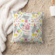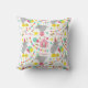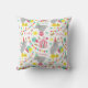 Um travesseiro com um padrão temático circo com ilustrações de elefantes vestindo chapéus, bunting, tenda de circo, estrelas, bolinhas e amendoins. Design tem um esquema de cores feminino. Personalize o nome.