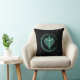 Cruze com um coração atrás dele dentro de um design de círculo num travesseiro decorativo verde esmeralda e fundo preto.